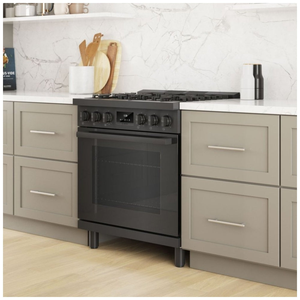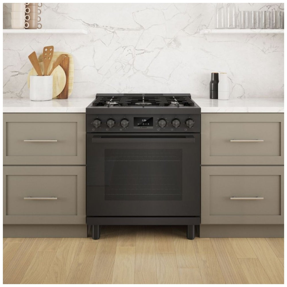 Bosch 800 Series HDS8045C Dual Fuel Range, 30 inch Exterior Width, Convection, 5 Burners, 4.0 cu. ft. Capacity, 1 Ovens, Black Stainless Steel colour True European Convection, Temperature Probe