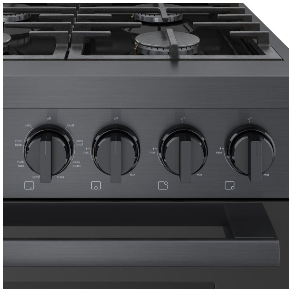 Bosch 800 Series HDS8645C Dual Fuel Range, 36 inch Exterior Width, Convection, 6 Burners, 3.7 cu. ft. Capacity, 1 Ovens, Black Stainless Steel colour Soft Close Door, Telescopic Gliding Extension Rack, Temperature Probe