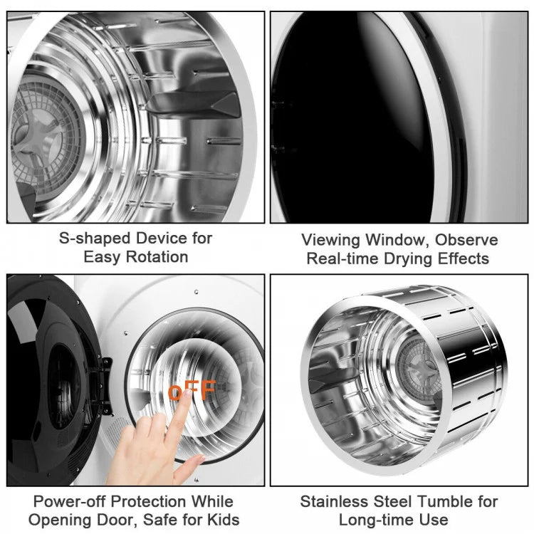 ● Energy Efficient and Quiet Tumbling: This portable dryer equipped with Four- layers intake & exhaust filter that is easy to clean, to work efficiently and automatic shut off to save energy. Experience reduced disruption with the quiet tumbling functionality, allowing you to run the dryer when sleeping or when going about your daily routine without excess loud noises.