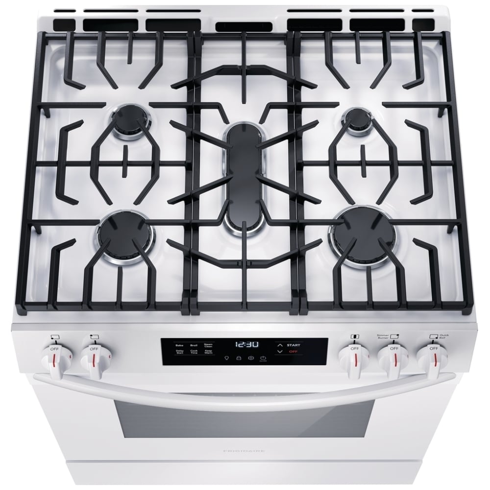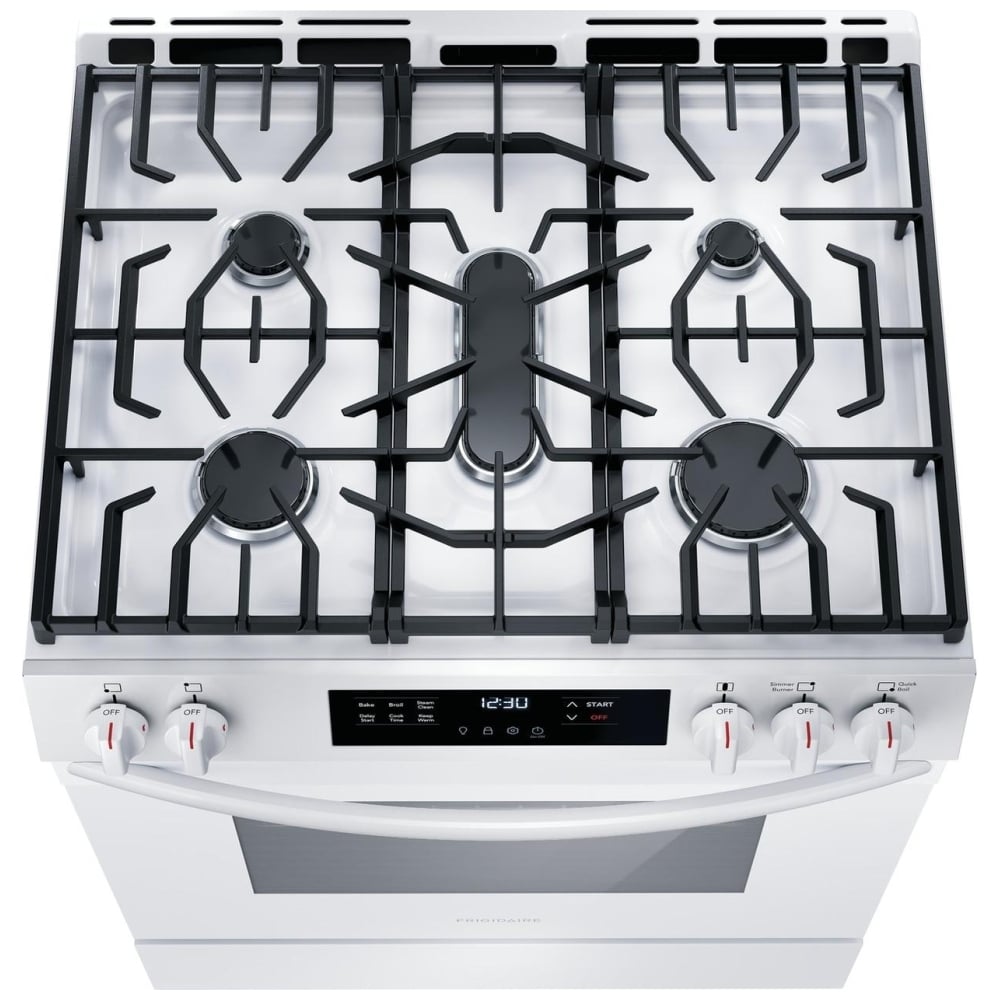 - What are the dimensions of the Frigidaire 30" Front Control Gas Range with Quick Boil FCFG3062AW?