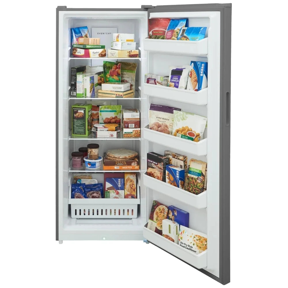 The Frigidaire FFUE1626AV upright freezer is a smart, space‑saving solution for busy households that need extra cold storage without sacrificing convenience or efficiency. With a generous 16.0 cu. ft. capacity and a streamlined 27.75" width, it offers plenty of room for bulk groceries, meal prep, and long‑term storage while still fitting comfortably in most kitchens, basements, or garages. One of its standout advantages over many standard freezers is the convertible design that lets you switch the interior from freezer to refrigerator mode at the touch of a control, giving you flexible storage that can adapt to seasonal needs, entertaining, or growing families. This model is also Garage Ready, engineered to perform reliably in a wider range of ambient temperatures, so you can confidently place it in a garage or utility space without worrying about inconsistent cooling. Inside, the EvenTemp™ cooling system circulates air evenly throughout the cabinet to help maintain a consistent temperature from top to bottom, reducing warm spots and helping your food stay fresher for longer. For added peace of mind, Power Outage Assurance is designed to help keep food frozen for a period of time during unexpected outages, while door‑ajar and high‑temperature alarms alert you if the door is left open or the interior temperature rises, so you can act before food quality is compromised. Organization is simple thanks to a flexible interior layout that includes four adjustable glass shelves, a full‑width basket, and multiple fixed door bins, allowing you to customize the space for everything from large cuts of meat to frozen snacks. Bright LED lighting makes it easy to see items at a glance, and the smooth, fingerprint‑resistant stainless‑steel look exterior keeps the appliance looking clean with minimal effort. Energy‑conscious households will appreciate that this model is ENERGY STAR® certified, helping to reduce utility costs without sacrificing performance. With its combination of convertible functionality, garage‑ready engineering, advanced cooling, and thoughtful safety features, the Frigidaire FFUE1626AV delivers a level of versatility and reliability that sets it apart from many conventional upright freezers in its class.