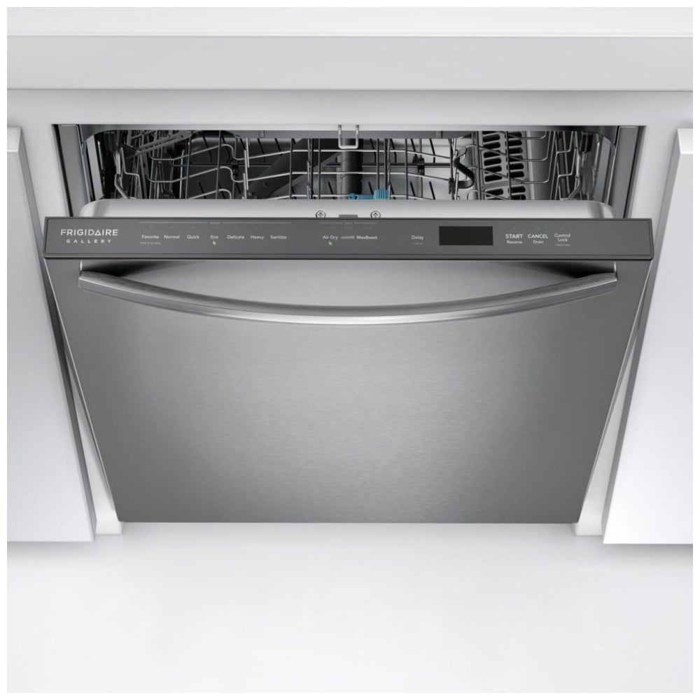 The Frigidaire Gallery GDSH4715AF Dishwasher features CleanBoost Technology, NSF-Certified Sanitize Option, DishSense Sensor Technology, OrbitClean Wash System, Third-Level Rack, Adjustable Racks, Convenient Status Indicator Floor Light, Smudge-Proof Stainless Steel, and MaxBoost Dry Technology.