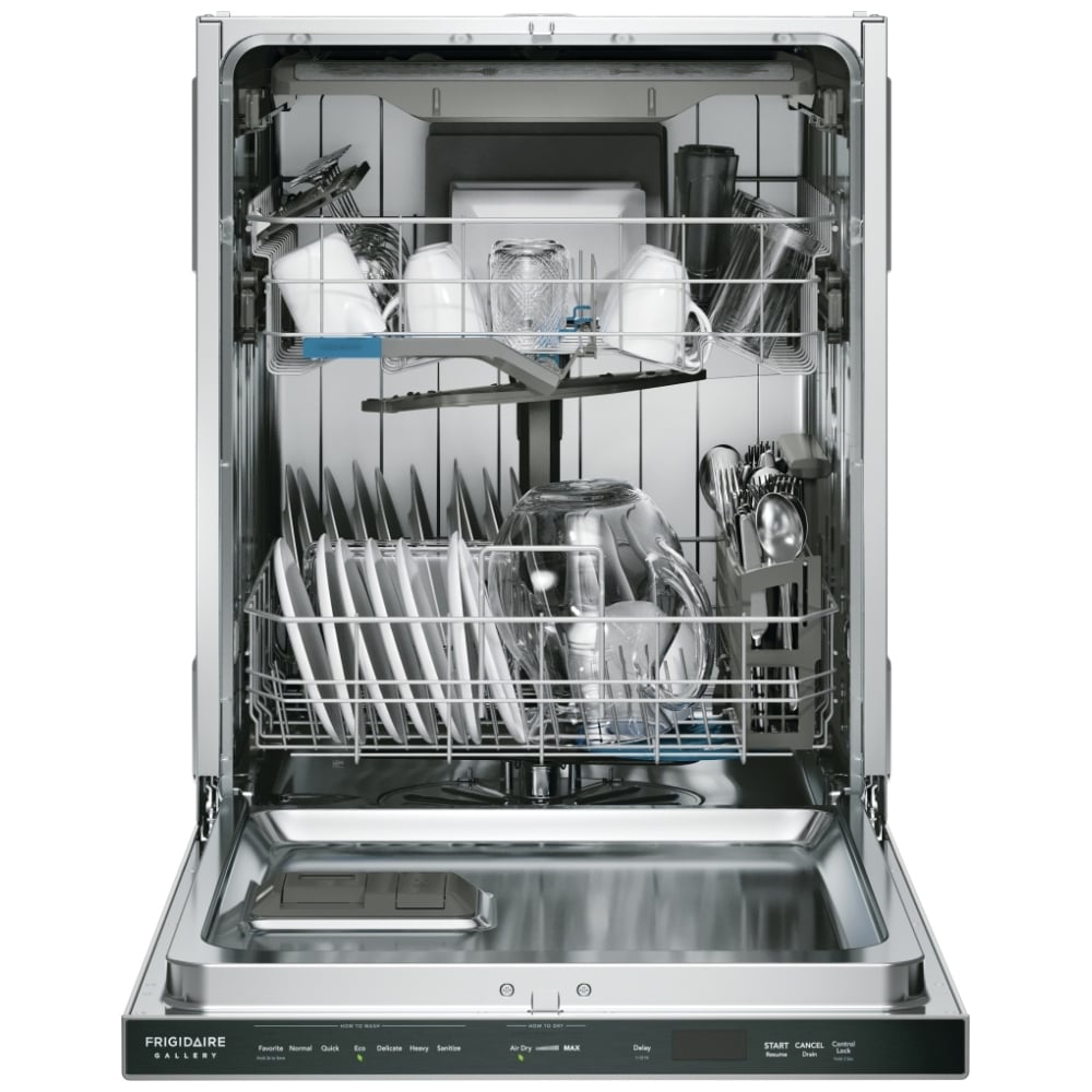 The Frigidaire Gallery GDSP4715AF Dishwasher has a 24" exterior width and a capacity of 14 place settings.