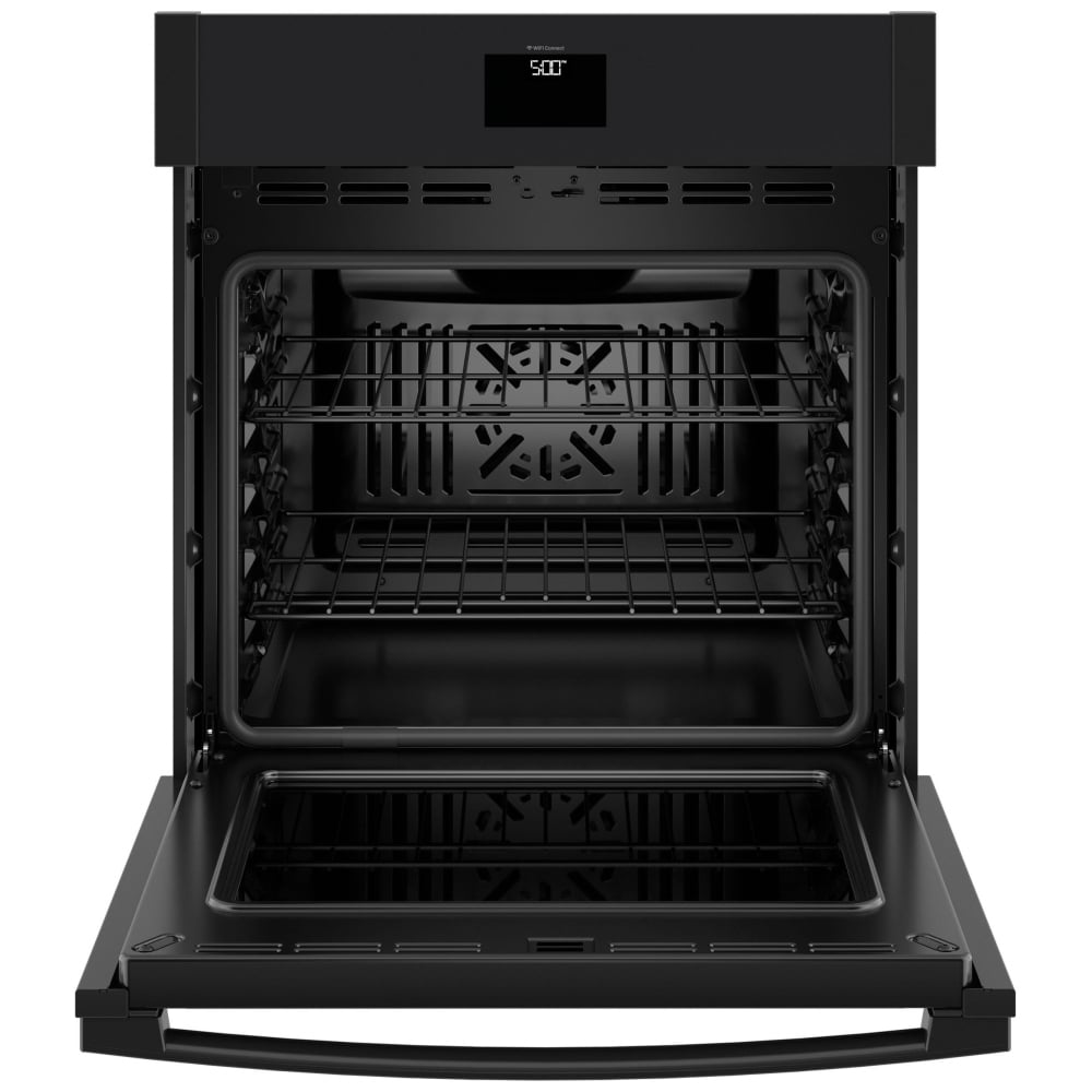 The GE JKS5000DVBB Single Wall Oven features No Preheat Air Fry, True European Convection, Anywhere control with remote notifications, Remote Monitored Temperature Probe, and more.