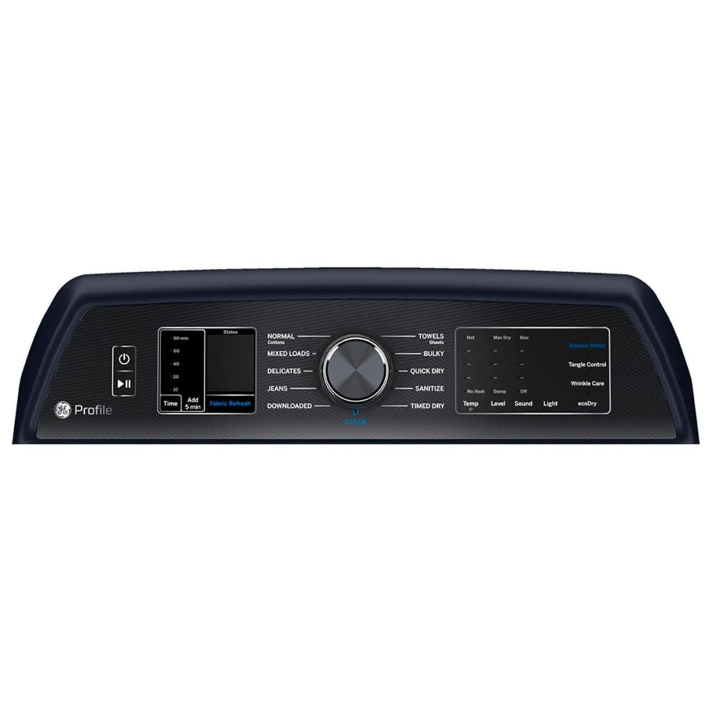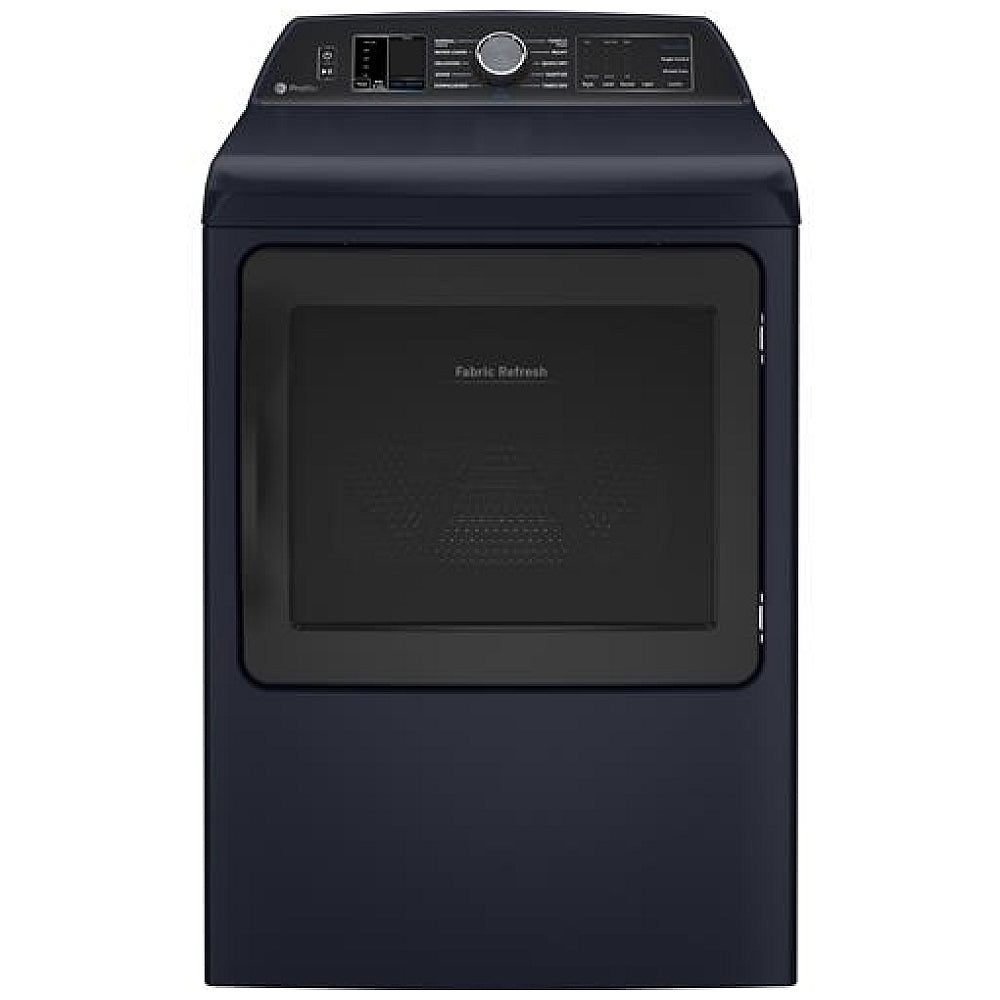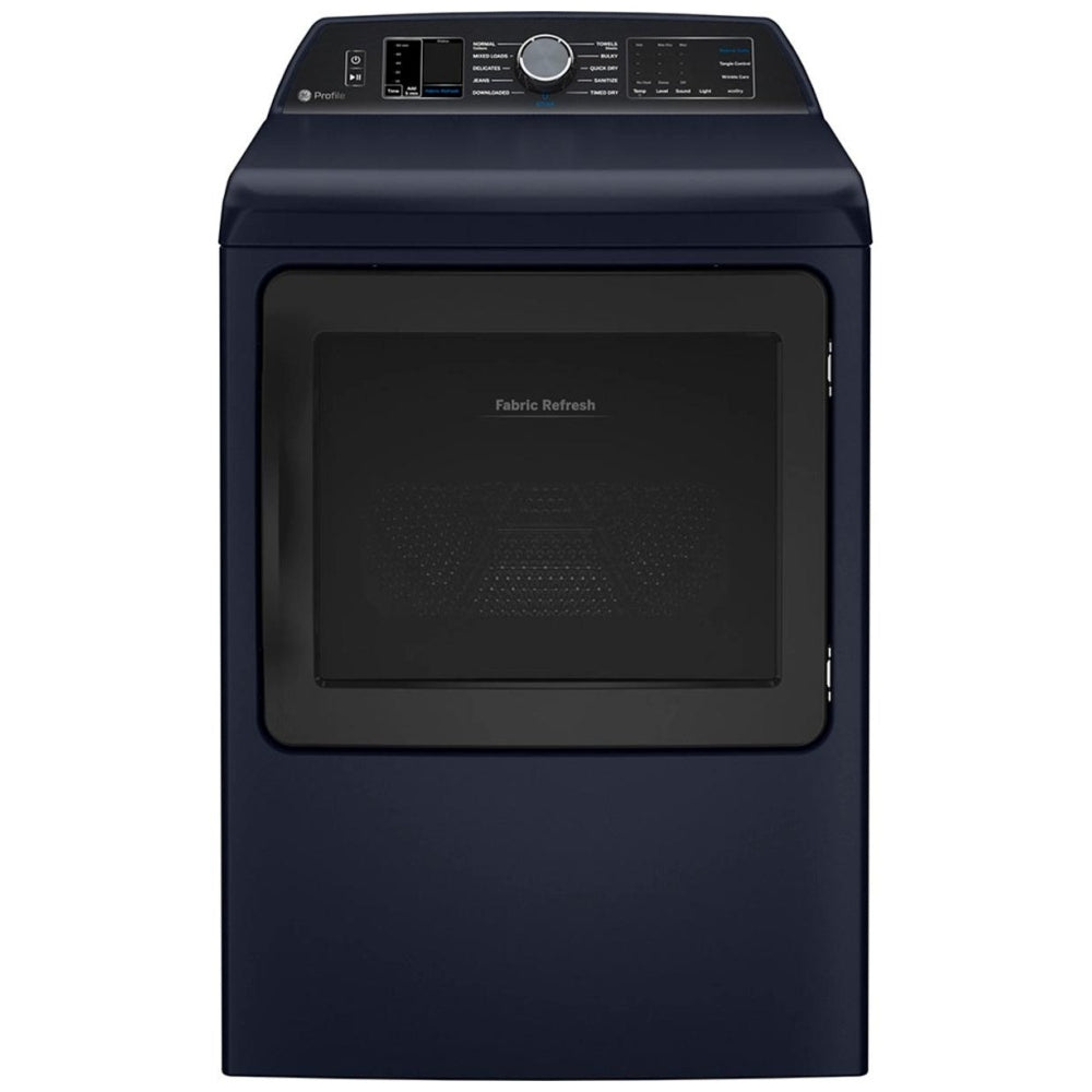 The GE Profile PTD90EBMTRS Electric Dryer features Steam Clean, 5 Temperature Settings, Wifi Enabled, Sapphire Blue colour.