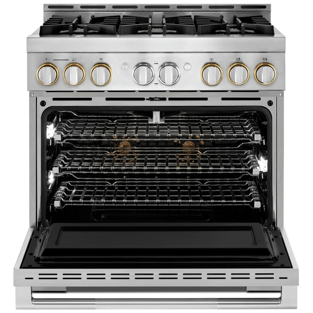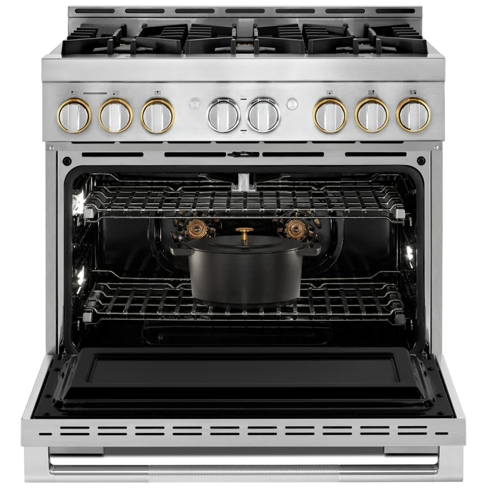 The Jenn-Air Rise JGRP436HL range is a premium kitchen appliance that offers superior performance and style. This 36-inch gas range comes equipped with six powerful burners that can deliver up to 20,000 BTUs of heat. The burners are controlled by front-mounted knobs that make it easy to adjust the heat level to your liking. Additionally, the range has a spacious 5.1 cubic feet capacity oven that features convection technology. This ensures that your food is cooked evenly and thoroughly.