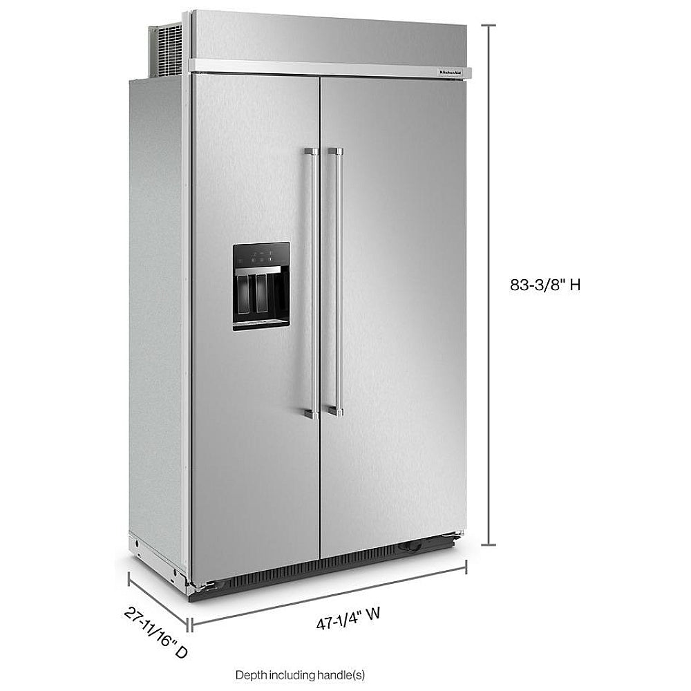 The dimensions of the KitchenAid KBSD708MSS Built In Refrigerator are 48" wide, 36" deep, and 29.4" tall.