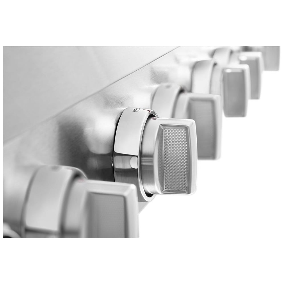 - 6 Burners, including 5,000 BTU Simmer & Melt Burner, Chrome-Infused Electric Griddle, and Three-Level Convertible Grates