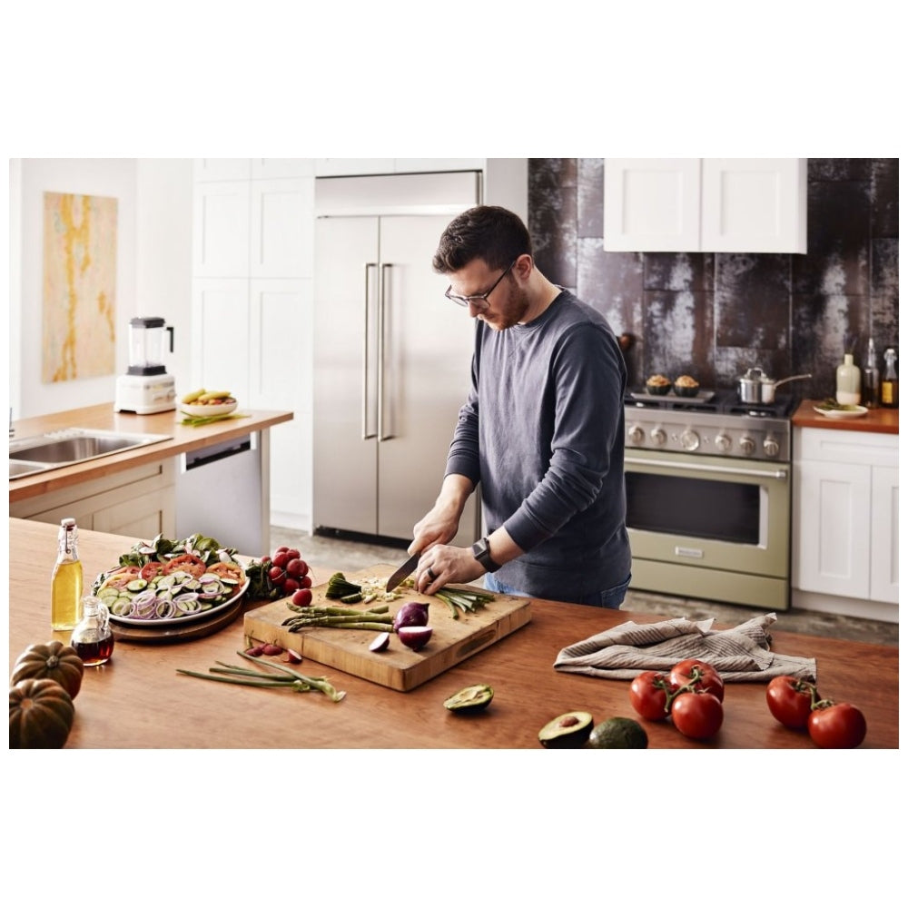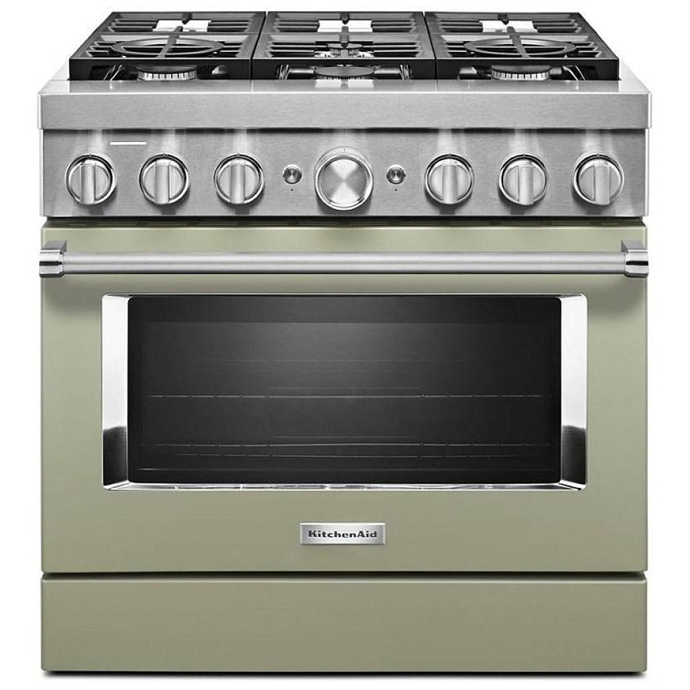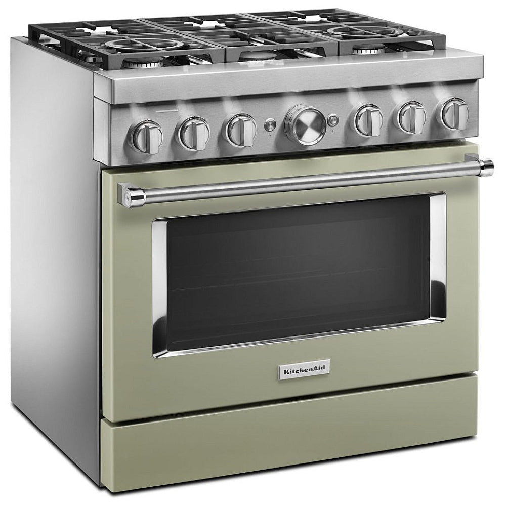 KitchenAid KFDC506JAV Dual Fuel Range, 36 inch Exterior Width, Self Clean, Convection, 6 Burners, 5.1 cu. ft. Capacity, 1 Ovens, Avocado Cream colour True European Convection, Telescopic Gliding Extension Rack