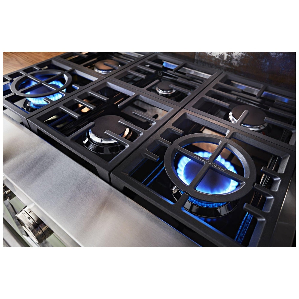 Expand your skills with a 36-inch KitchenAid® Commercial Style Range with 6 burners. This dual fuel range combines a gas cooktop with the even baking of an electric oven. Two 20,000 BTU Ultra Power™ Dual-Flame Burners offer the power and precision to successfully sear, simmer, stir-fry and saut(eback). Even-Heat™ True Convection helps you achieve more consistent baking and roasting.