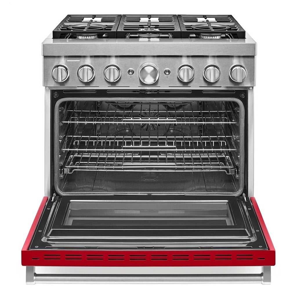 KitchenAid KFDC506JPA Dual Fuel Range, 36 inch Exterior Width, Self Clean, Convection, 6 Burners, 5.1 cu. ft. Capacity, 1 Ovens, Passion Red colour True European Convection, Telescopic Gliding Extension Rack