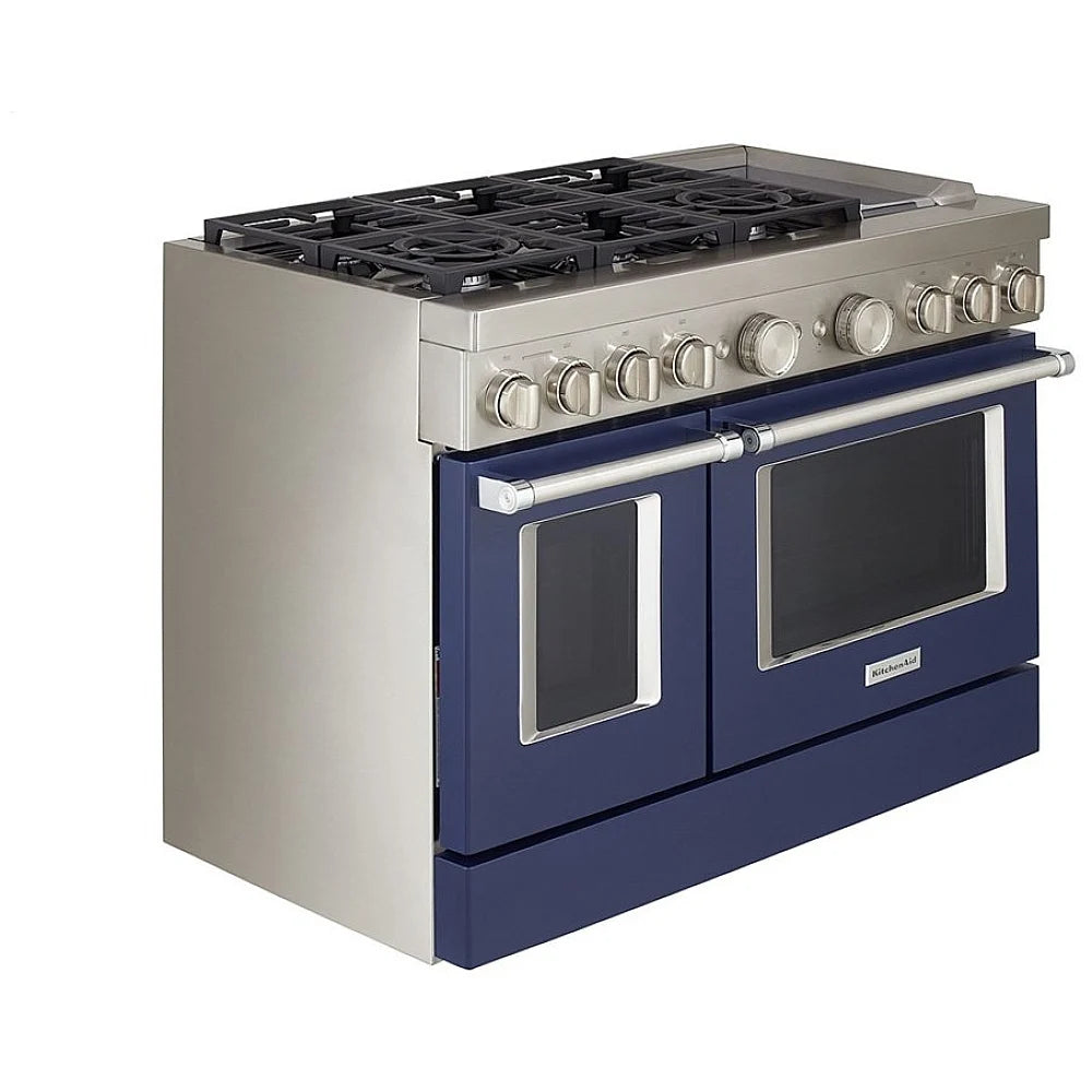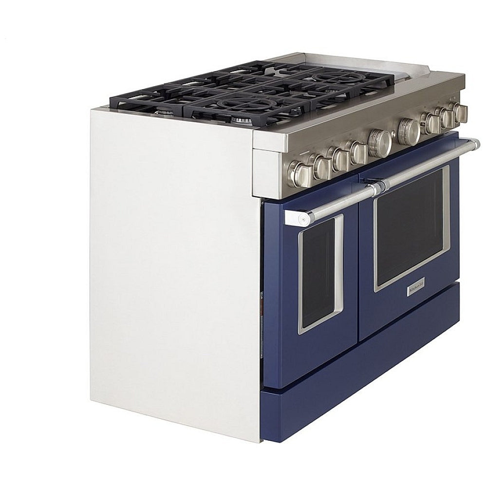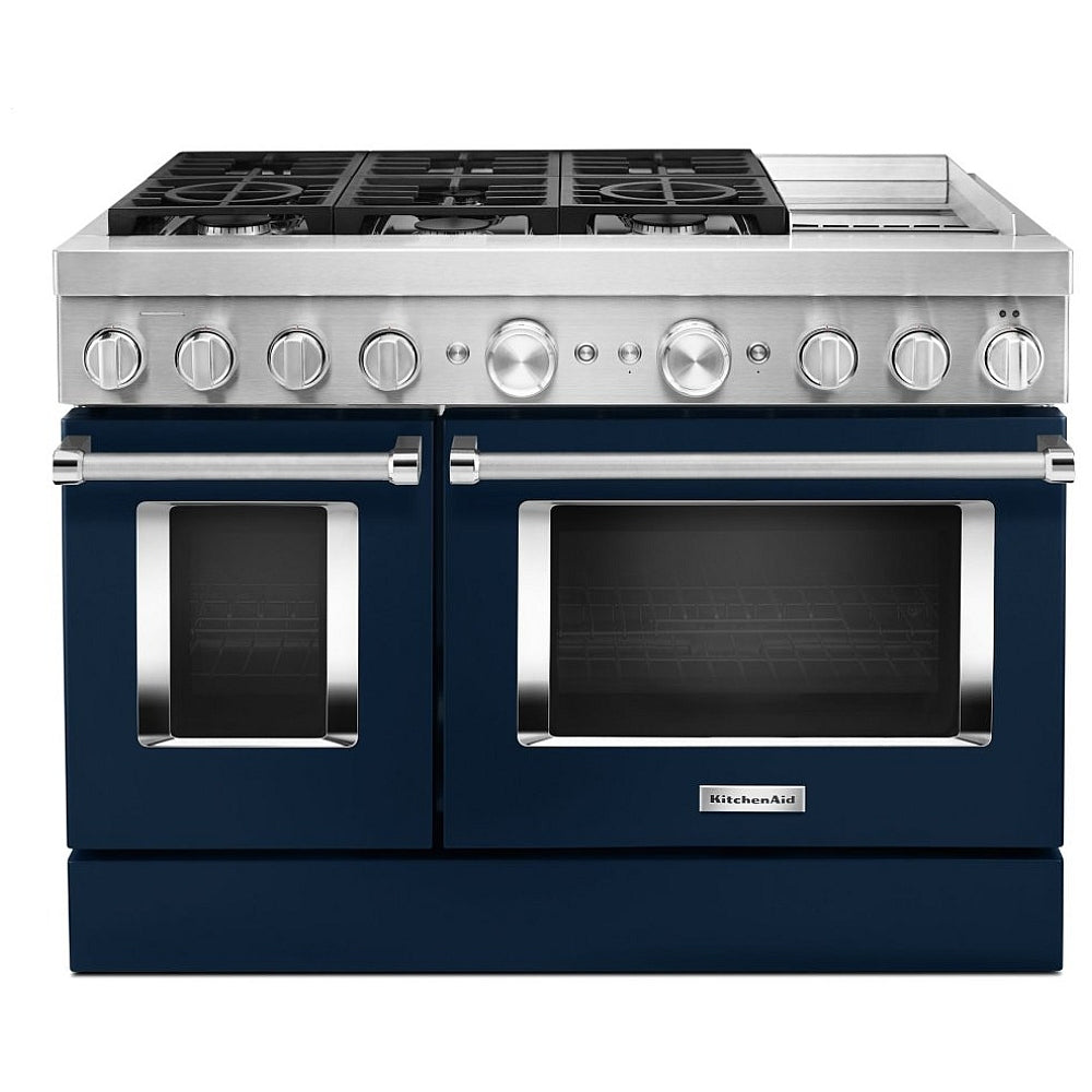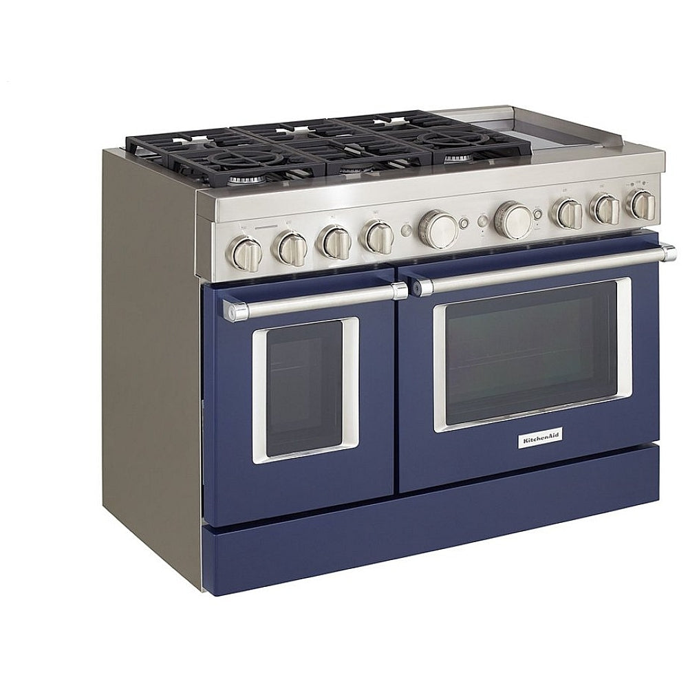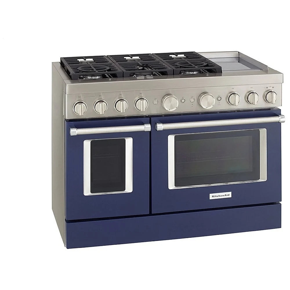 KitchenAid KFDC558JIB Dual Fuel Range, 48 inch Exterior Width, Self Clean, Convection, 6 Burners, 6.3 cu. ft. Capacity, 2 Ovens, Ink Blue colour True European Convection, Griddle, Telescopic Gliding Extension Rack, Temperature Probe