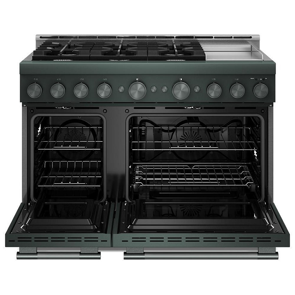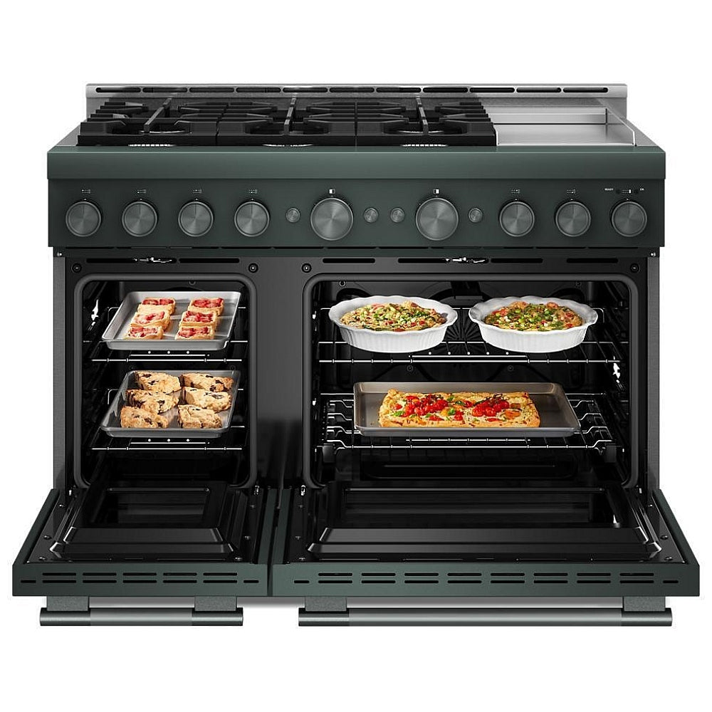 The KitchenAid KFGD948SJP 48-inch commercial-style gas range with griddle is designed for serious home cooks who want restaurant-inspired performance wrapped in a striking Juniper finish. At 48 inches wide, it instantly becomes the focal point of your kitchen, combining a powerful 6-burner gas cooktop, a chrome-infused electric griddle, and a spacious double oven with a total capacity of 6.3 cu. ft. This range is all about versatility and control, letting you move seamlessly from high-heat searing to gentle simmering while preparing multiple courses at once. Two High-Heat Dual Flame Burners provide exceptional flexibility, delivering up to 20,000 BTU for intense stir-frying or fast boiling, yet dialing down smoothly for delicate sauces on the same burner. The integrated Chrome-Infused Electric Griddle is a standout feature that many ranges in this class simply don’t offer, giving you a broad, precisely heated surface for pancakes, smash burgers, grilled sandwiches, or seared scallops, all with quick preheating and edge-to-edge temperature consistency. Inside, the double oven is equipped with Even-Heat™ True Convection, using a specialized bow-tie design and fan to circulate hot air evenly, so roasts come out juicy, pastries bake up flaky, and sheet-pan dinners brown beautifully from corner to corner. The oven also includes a convenient No Preheat Air Fry mode, allowing you to achieve crispy, golden results on favorites like wings, fries, and vegetables with less oil and no waiting for preheat. Thoughtful details elevate everyday cooking, from the Backlit Dual-Dial Oven Knob that lets you choose modes like Air Fry, Bake, Broil, or Convection while interactive lighting shows preheat progress, to cooktop backlit knobs that glow when burners are on for an at-a-glance safety check. Edge-to-edge cast-iron grates make it easy to slide heavy pots across the surface, while the integrated wok grate lets you nestle a round-bottom wok directly into the flame for authentic high-heat stir-fry. Finished in rich Juniper with pro-style lines and customizable hardware options, the KitchenAid KFGD948SJP doesn’t just cook like a commercial range—it looks the part, turning your kitchen into a true culinary workspace.