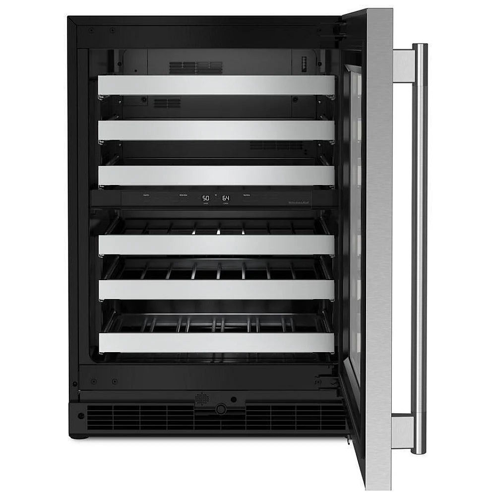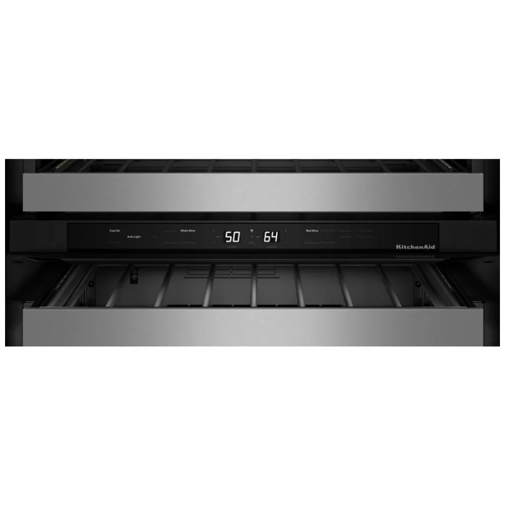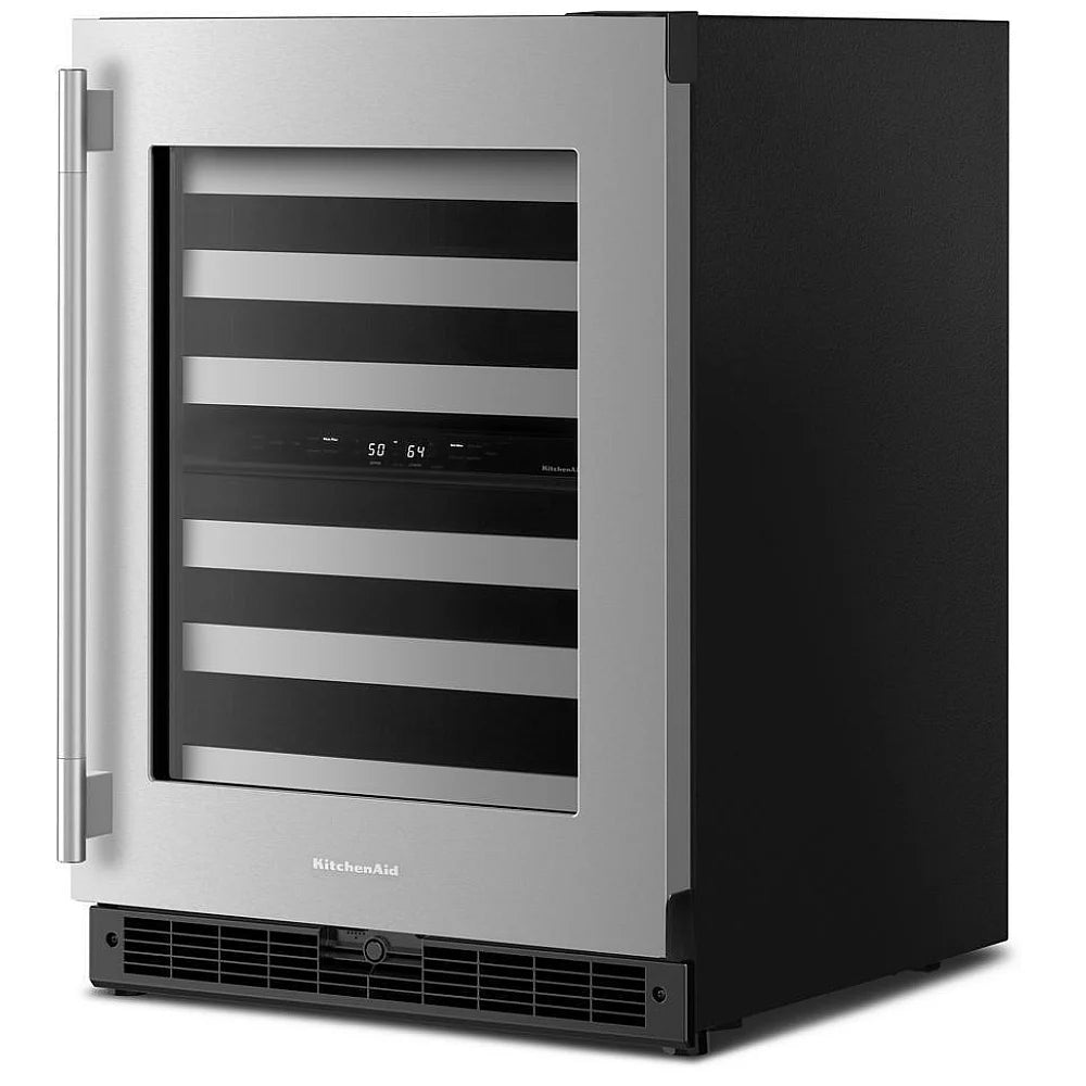 The KitchenAid® KUWR324SSB undercounter wine cellar is a premium choice for enthusiasts who want restaurant‑style wine storage seamlessly integrated into their kitchen or bar. Designed at a sleek 24" width, it tucks neatly under standard countertops while still offering an impressive 4.97 cu. ft. capacity, accommodating up to 46 standard Bordeaux‑size bottles on six thoughtfully arranged racks. This capacity, combined with its compact footprint, makes it ideal for both serious collectors and frequent entertainers who need easy access to a well‑organized selection of reds, whites, and sparkling wines without sacrificing cabinet space.