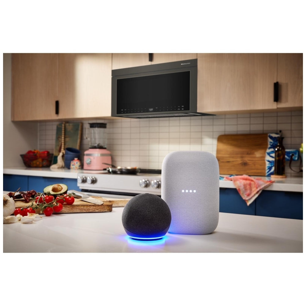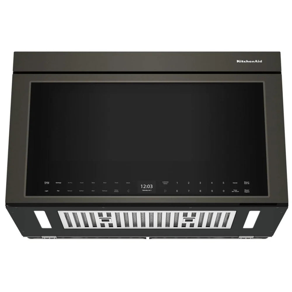 The KitchenAid® YKMMF530PBE multifunction over-the-range microwave is designed for home cooks who want the power of several appliances in one sleek, built-in unit. With a generous 1.1 cu. ft. capacity and a full 30" width, it comfortably accommodates a 9" x 13" casserole dish, a mixing bowl, or multiple plates at once, making it ideal for both everyday meals and entertaining. What truly sets this model apart is its advanced Air Fry Mode, which replaces a separate countertop air fryer by using triple heating elements and a powerful fan to circulate hot air around the included dishwasher-safe air fry basket, delivering crispy, golden results with less oil and none of the extra clutter on your counters. Beyond air frying, this microwave features versatile Multifunction Oven Modes that allow it to stand in for a convection or toaster oven, so you can bake, roast, broil, toast, and even use dedicated Air Bake and Roast settings at temperatures up to 450°F, freeing up valuable counter space while expanding what you can cook in a single appliance. The distinctive Flush Built-In Design gives your kitchen a premium, integrated look by aligning the door face with surrounding cabinetry within a standard over-the-range cutout, so the appliance blends seamlessly into your space instead of protruding into it. Inside, a clever Turntable-Free Design maximizes usable cooking area by eliminating the traditional rotating plate; a hidden motor circulates microwave energy evenly throughout the cavity, making it easier to place large or multiple dishes without worrying about clearance or balance. This model is also a Smart Appliance, allowing you to remotely preheat, monitor, and control cooking modes through the KitchenAid™ app or with simple voice commands via compatible Google® Assistant or Alexa®-enabled devices, giving you hands-free convenience when your attention is on prep work or guests. Thoughtful details like backlit touch controls that fade into the black glass door, bright LED cooktop lighting with a night-light setting, a three-speed 400 CFM ventilation system, and intuitive microwave presets for tasks like reheating, softening, melting, and defrosting all come together to make the KitchenAid® YKMMF530PBE a standout choice for anyone looking to upgrade to a high-performance, design-forward over-the-range microwave that truly does more than the standard model.