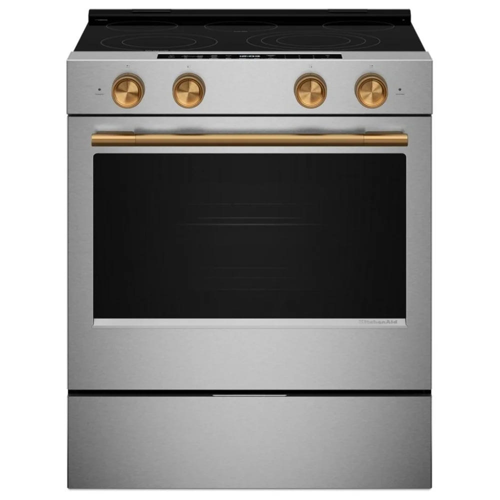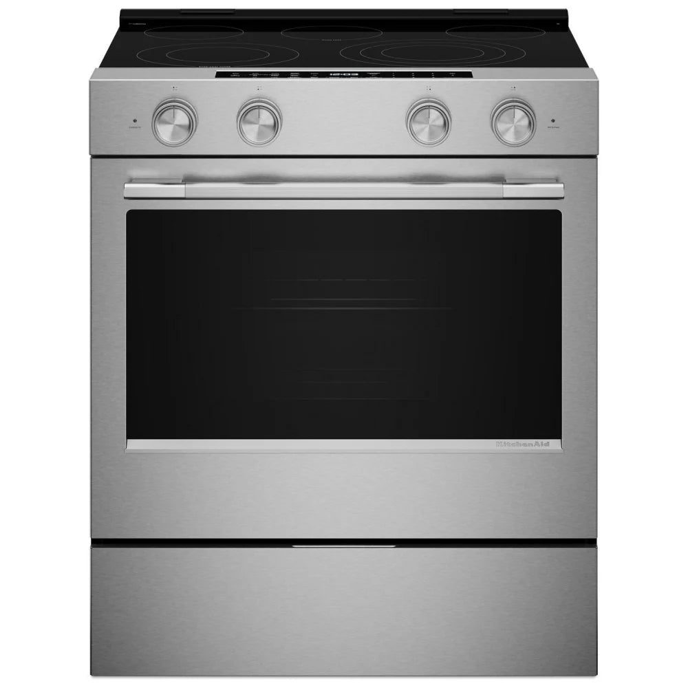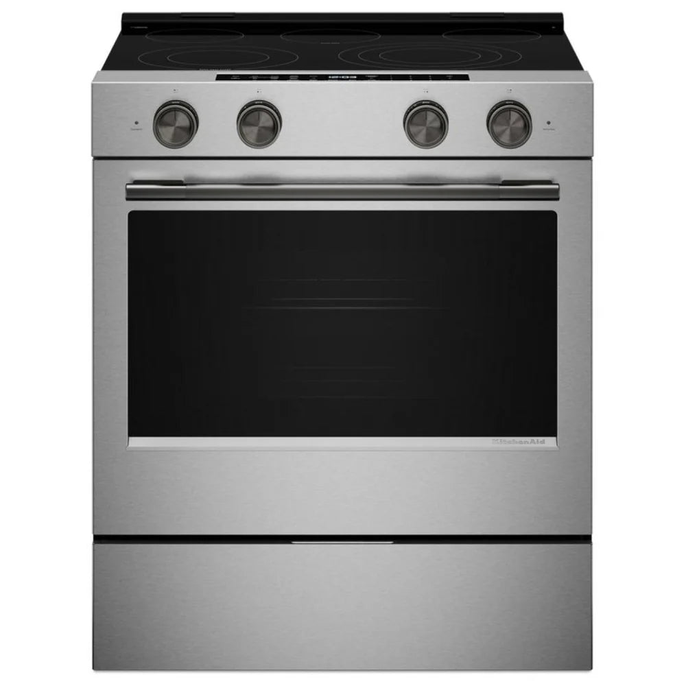 Enjoy a range of possibilities with a KitchenAid electric range. A WiFi-enabled Smart Appliance featuring Convection Cooking Modes that help you get consistent results with optimal temperatures. Move pots and pans easily from cooktop to countertop with an Edge-to-Edge Glass Cooking Surface. A spacious 5.3 Cu. Ft. Capacity and optimized oven system design with Rapid Preheat gets your oven to 350°F in under 8 minutes*. Even-Heat™ Fan Convection features a unique bow-tie design with a heating element and fan that circulates hot air throughout the entire oven. Keep your oven clean with two distinct cleaning cycles: the Steam Clean Cycle, perfect for quick, routine maintenance, and the high-temperature Self-Clean Cycle for a deeper clean.