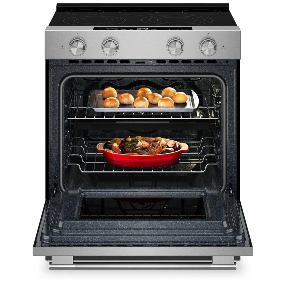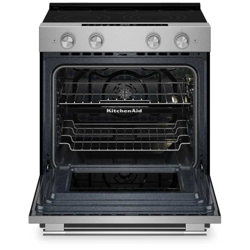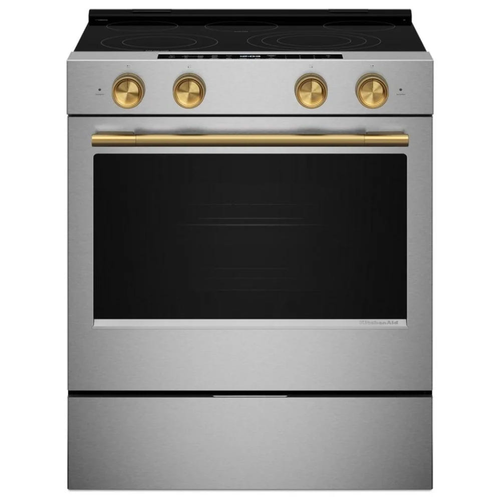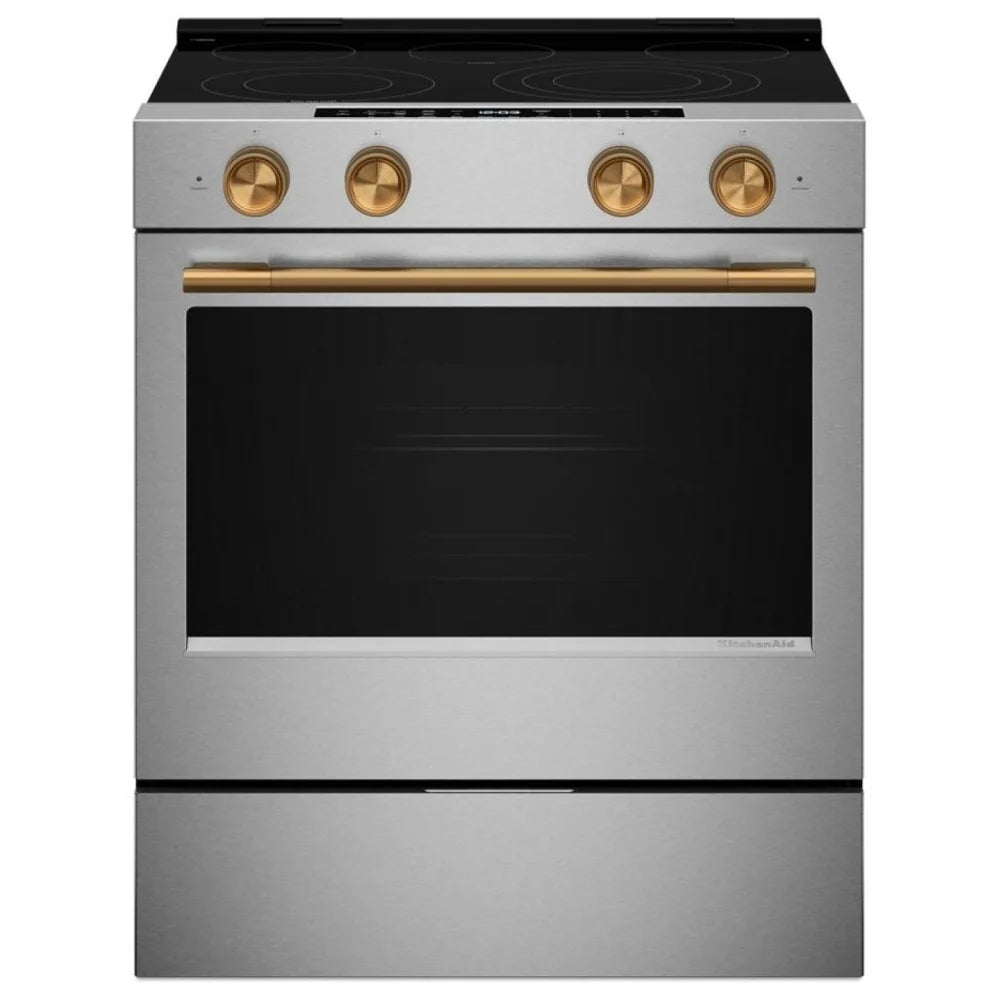 Enjoy a range of possibilities with a KitchenAid electric range. A WiFi-enabled Smart Appliance featuring Convection Cooking Modes that help you get consistent results with optimal temperatures. Move pots and pans easily from cooktop to countertop with an Edge-to-Edge Glass Cooking Surface. A spacious 5.3 Cu. Ft. Capacity and optimized oven system design with Rapid Preheat gets your oven to 350°F in under 8 minutes*. Even-Heat™ Fan Convection features a unique bow-tie design with a heating element and fan that circulates hot air throughout the entire oven. Keep your oven clean with two distinct cleaning cycles: the Steam Clean Cycle, perfect for quick, routine maintenance, and the high-temperature Self-Clean Cycle for a deeper clean.