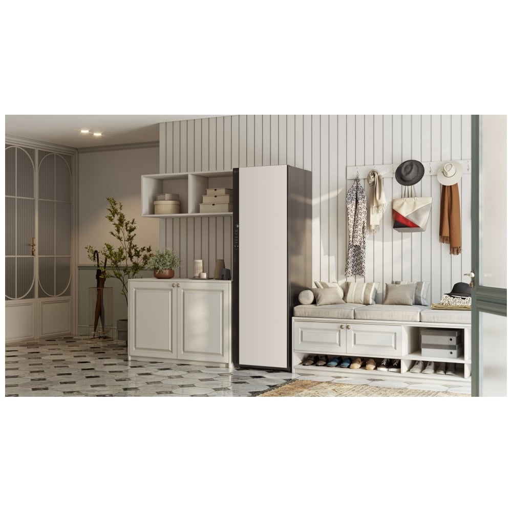 The LG SC5GMR80H Styler Steam and Steam Closet brings professional garment care into your home, combining advanced steam technology with a sleek, full-length mirrored design that doubles as a dressing-room essential. Behind the door, this smart steam closet is engineered to sanitize, refresh, and deodorize hard‑to‑wash items using Dual TrueSteam® Technology, a premium feature that uses two dedicated steam outlets to penetrate deep into fabrics without relying on harsh chemicals. From tailored suits and delicate blouses to outerwear and bedding, the unit gently treats a wide range of textiles while helping reduce allergens, odors, and everyday wrinkles. Five spacious hangers plus a dedicated pants hanger give you generous capacity for multiple outfits at once, all within a compact footprint that’s just under 24 inches wide, making it easy to integrate into walk‑in closets, laundry rooms, or bedroom suites. What truly sets this model apart is the integrated Dynamic MovingHanger™ system, which uses multiple specialized motions to shake out dust and wrinkles as steam circulates, delivering more thorough, even results than static steam cabinets. For times when you want extra precision, the built‑in HandySteamer™ stores neatly inside and offers targeted wrinkle reduction and finishing touches right where you need them, ideal for collars, cuffs, and detailed garments. The EZ Fit PantsPress™ feature inside the door helps maintain crisp creases and smooth out wrinkle‑prone areas on dress pants, so you can step out looking freshly pressed without ever touching an iron. A Dual Inverter HeatPump™ works at lower temperatures to gently dry delicate items and speed up refresh cycles while helping protect fabrics from heat damage, and the AutoFresh System™ keeps air circulating to reduce moisture and keep garments feeling newly treated even if you can’t unload them right away. Finished with a premium smart LCD touch display and ThinQ® connectivity for remote control and cycle monitoring, the LG SC5GMR80H Styler Steam and Steam Closet is an ideal upgrade for anyone who wants dry‑cleaner‑level care, convenient daily refreshes, and a modern, space‑saving garment care solution at home.
