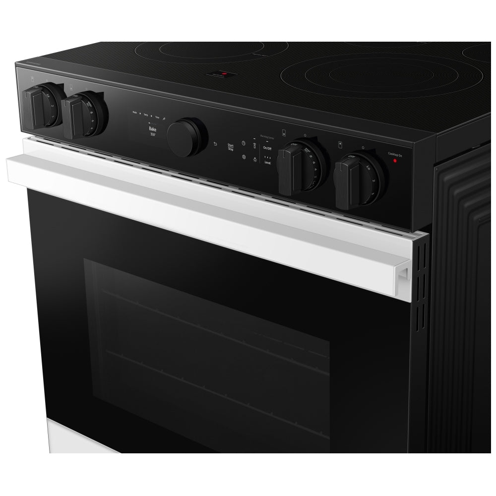 Samsung Bespoke NSE6DB850012AC Electric Range, 6.3 cu. ft. Capacity, 30 inch Exterior Width, Convection, 5 Burners, Storage Drawer, & , Self Clean, 3,600 Watts Highest Burner Element, White colour True European Convection