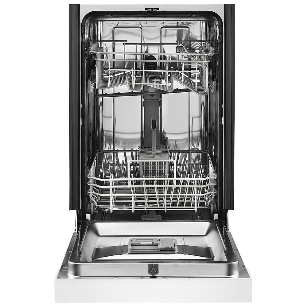 The dimensions of the Whirlpool WDPS5118PW Dishwasher are 18" Exterior Width, 24" Height, and 24" Depth.