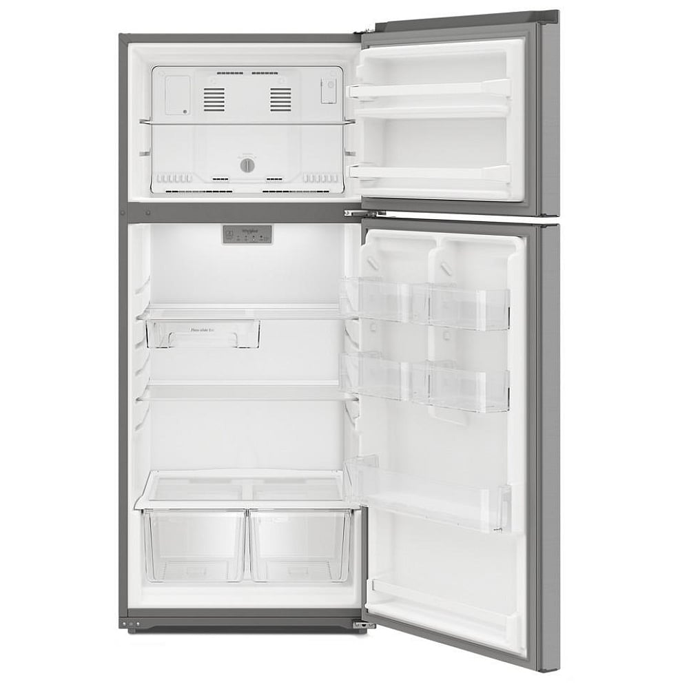 - What features does the Whirlpool WRTX5028PM Top Freezer Refrigerator have?